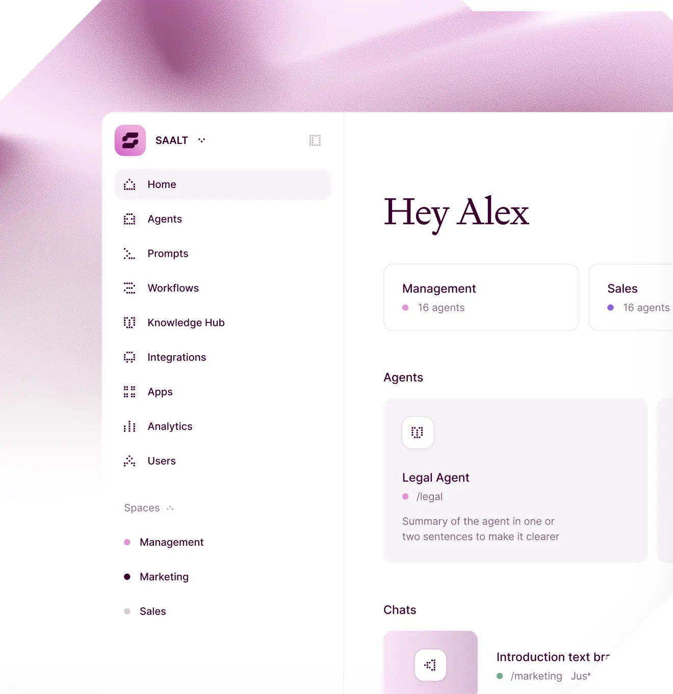 SAALT verbindet sich mit Ihren Systemen, versteht Ihre Prozesse und gibt jedem Team einen eigenen KI-Agenten. Bei voller Datensouveränität.